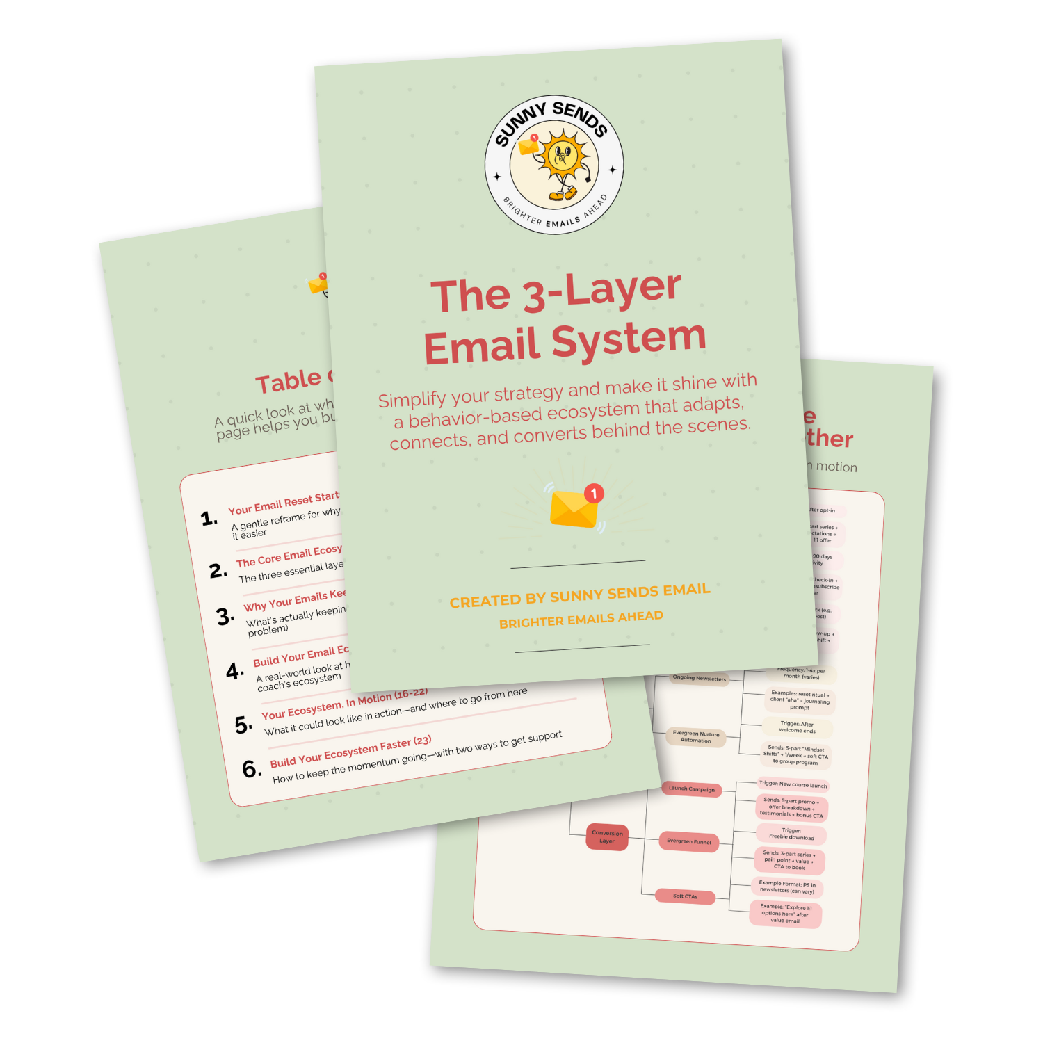 If you’re tired of winging it, wondering what to send next, or feeling stuck between burnout and silence, The 3-Layer Email System is 25 pages of pure email marketing gold that with will show you how to create a simple, sustainable system with ease that supports your business (and most importantly, your sanity).